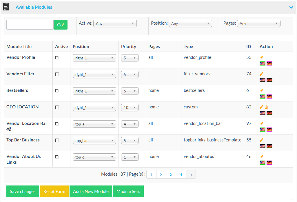 | Action | Additional functions to manage the module and also language flag indicators for the available language specific version of the module. |