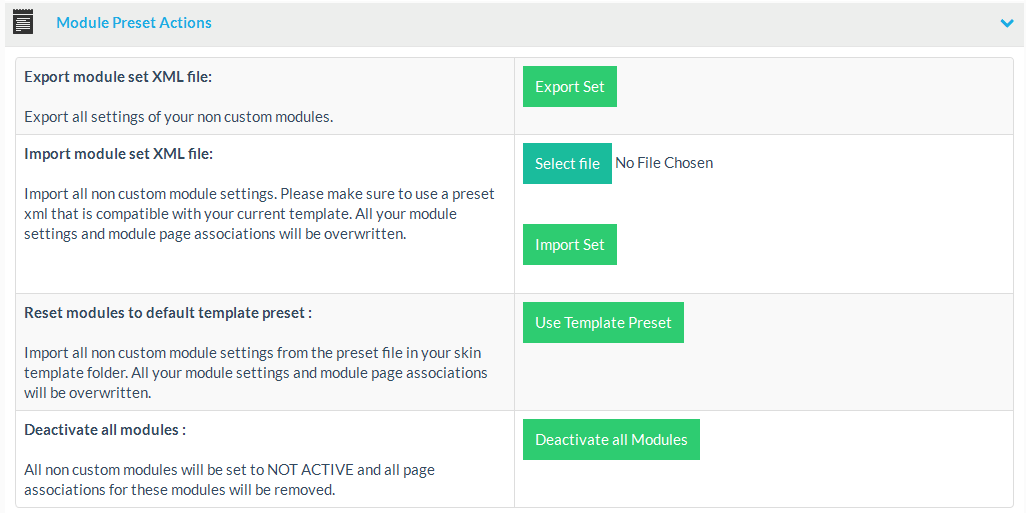 Please note: All your module settings and module page associations will be overwritten when you import a new module set configuration, reset the modules to their default state or deactivate all modules.