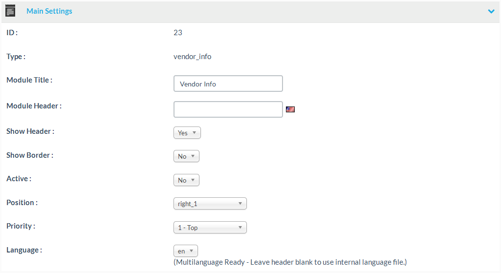 | Language | The language for title and content of the module. Please note: Some modules are “multilanguage ready”, which means they will use your shop storefront language files for the module headers. If you want to use the language file text, instead of the text you can enter at the details page, leave the header field blank. |