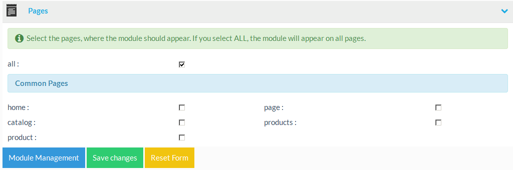 The pages section determines the pages where the module appears at the storefront, if it is active.