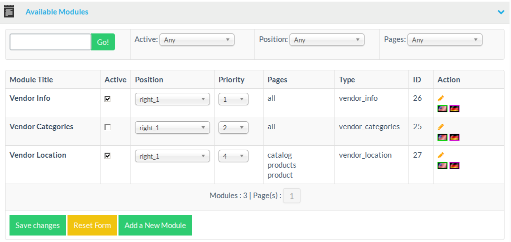 Please note: The vendor module manager is only for vendor specific modules. These vendor specific modules are modules that are configured separately for each vendor. If you want to use the same setting for all vendors or don’t want your vendors to be able to configure their own modules, use the modules listed in the general mall module manager instead.