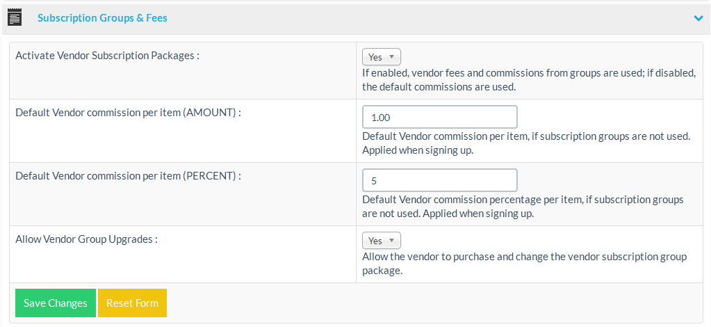 Use the subscription groups & fees form to setup default vendor commissions and general settings on how to handle vendor groups & fees.