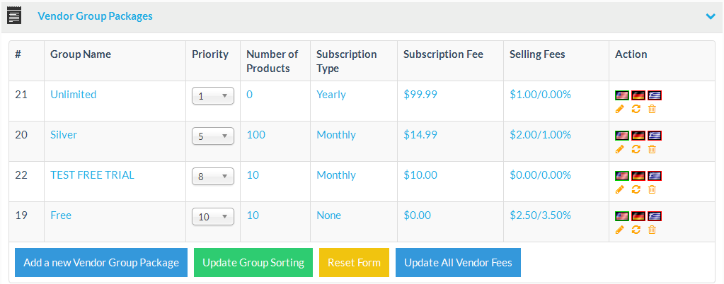 You can manage and add vendor subscription groups though the vendor group packages form below.