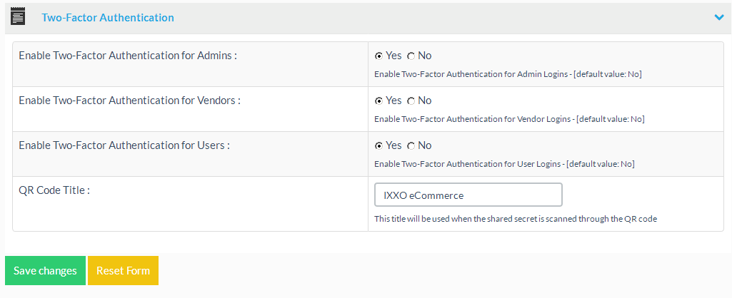 To enable two-factor authentication for administrators, vendors or users, select the desired option and press the “Save Changes” button.