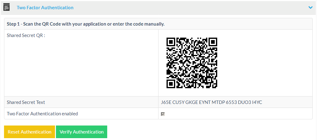 After the two-factor authentication for an account was activated, you will presented with a screen with the shared secret and a checkbox that shows if two-factor authentication was enabled or not.