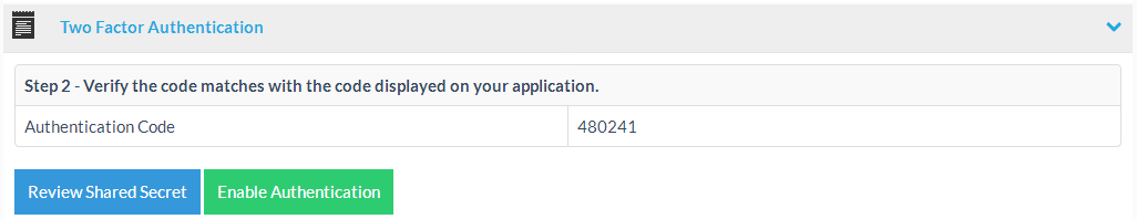 Press the “Enable Authentication” button to enable two-factor authentication with the current shared secret.