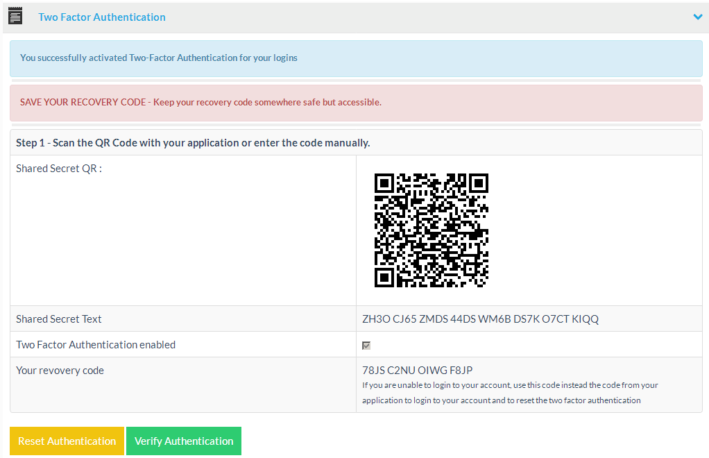 This section will also show a recovery code after the initial activation. This recovery code can be used instead of the code generated by the two-factor authentication application in an emergency case.