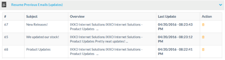 The resume previous product updates email section lists all previously saved product updates emails and allows you to resume a draft or a previously started email. It shows details about the internal email ID, the subject of your product updates email, an abbreviated overview of the main content and the last save date of the product updates draft.