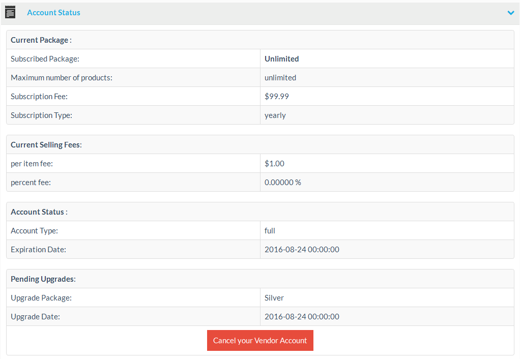 The account status page shows the account status, the current subscription package (if applicable) and it’s fees/limits, the current vendor selling fees. Pending account package upgrades are also shown.