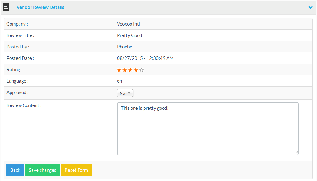 At the vendor review details page you can view and edit the details of a posted review.