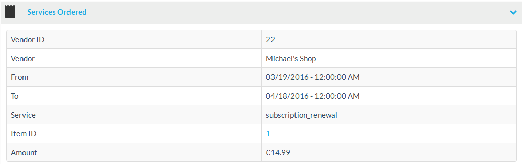 The services ordered section, lists information about the ordered service, like the vendor who ordered the service and the vendor’s ID, the service type, the time period of the service, as well as the item id of the ordered service and the amount.