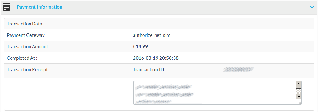 The payment information section, shows the transaction data, if present, including the payment gateway id, the transaction amount, the date the transaction was completed and usually a transaction receipt.