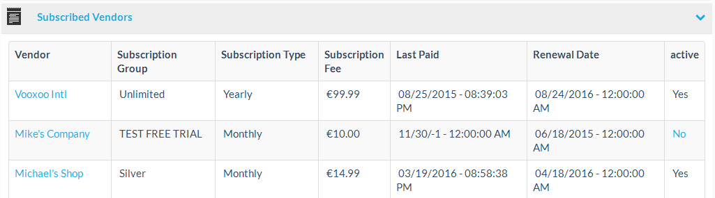 The subscribed vendors list shows all subscribed vendors with crucial information about their membership. The list shows information about the vendor’s subscription group, the subscription type and the subscription fee.